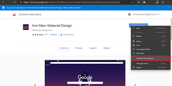 ■ Visit a theme page (note down the theme ID as it will be needed when uninstalling the theme) and right-click on “Add to Chrome” and select “Get CRX of this extension”.
