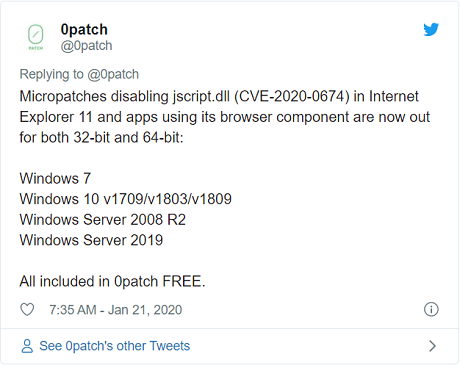 "If you're a 0patch user, you already have this micropatch downloaded to all your online computers with 0patch Agent, and - depending on your settings - already automatically applied to all processes using the Internet Explorer 11 engine for rendering content.