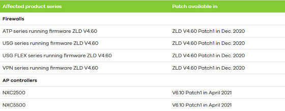 Patches are currently available only for the ATP, USG, USG Flex, and VPN series. Patches for the NXC series are expected in April 2021, according to a