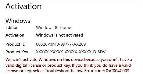 "We can't activate Windows on this device because you don't have a valid digital license or product key," the activation error reads on systems affected by this issue. "If you think you do have a valid license or key, select Troubleshoot below. Error code 0xc004c003."