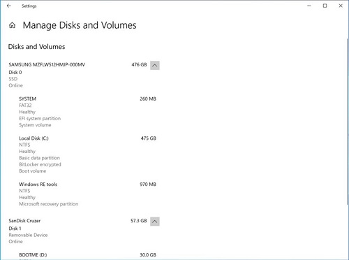 New modern Disk Management settings'Manage Disks and Volumes' utility supports better integration with the Storage Spaces and Storage Settings. The disk management tool has been rewritten, and it will initially allow you to view disk information, create and format volumes, and assign drive letters.