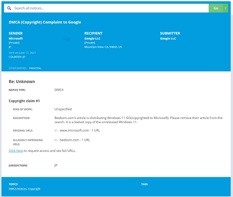 The DMCA request (first spotted by FossBytes) requests Google to remove Beebom‘s page from online search results. The DMCA takedown was found on the Lumen Database and contains the reason for the takedown request. The reason is that Beebom’s article “is distributing [a] Windows 11 ISO (copyrighted to Microsoft)” which is a problem for the company as “it is a leaked copy of the unreleased Windows 11.” This DMCA claim basically confirms that the leak is, in fact, legit.