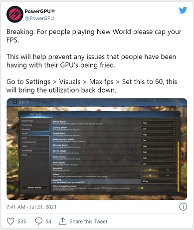 Hundreds of thousands of people played in the New World Closed Beta yesterday, with millions of total hours played. We’ve received a few reports of players using high-performance graphics cards experiencing hardware failure when playing New World.