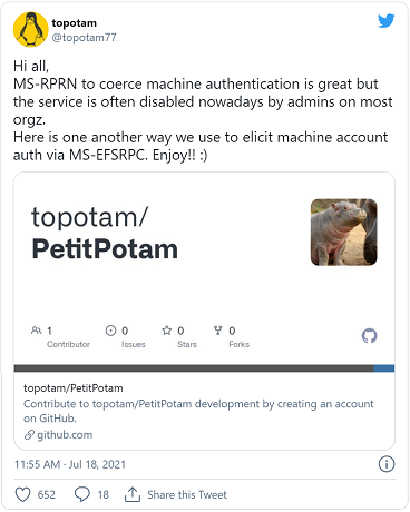 Update 7/24/21 16:15 EST: Added link to Microsoft's security advisory for PetitPotam attack.