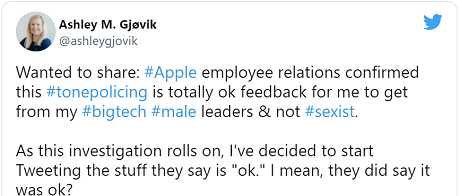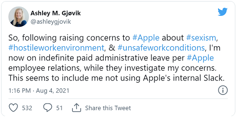 Apple has placed senior engineering program manager Ashley Gjøvik on indefinite administrative leave after she tweeted about sexism in the office. The company is currently investigating claims Gjøvik made about a hostile work environment.