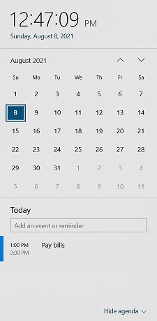 Windows 10 calendar flyout with eventsWith Windows 11, Microsoft removed the events section altogether and requires users to view them in the Calendar app or using the 'Calendar' option in the new Widgets section.