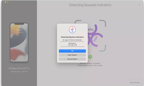 When iMazing finishes, you'll see an alert with the results. In my case, my iPhone 12 Pro did not show any signs of infection and had 0 warnings.