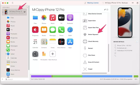 Next, scroll down through the action options on the right-hand side of iMazing until you locate Detect Spyware; click on it.