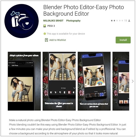 The app is called "Blender Photo Editor-Easy Photo Background Editor" and has been installed over 5,000 times to date.