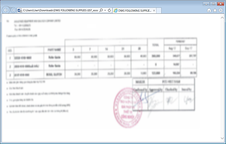 Blurred image of suppliers listThose who open the file can only see a blurred image of what is supposedly a supplier list, stamped and signed for an extra touch of legitimacy.