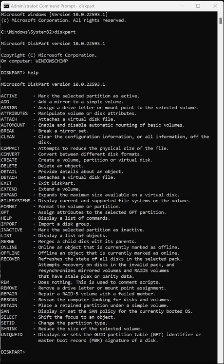 3. If you want to glance at the full list of available commands of DiskPart type