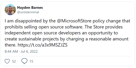 “Microsoft is an excellent open-source ecosystem steward and Microsoft Store policies are significantly better than those of the Apple App Store and Google Play Store for both app developers and consumers,” Barnes notes. “However, I strongly encourage Microsoft to revisit the proposed policy as written because it sweeps in legitimate open-source applications published by the official upstream projects. Revenue from sales in the Store supports independent open-source application developers and sustainable open source projects.”