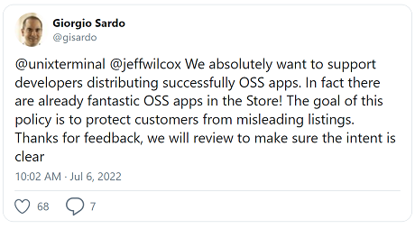 “We absolutely want to support developers distributing successfully OSS apps,” Sardo writes in a tweet. “In fact, there are already fantastic OSS apps in the Store! The goal of this policy is to protect customers from misleading listings.”