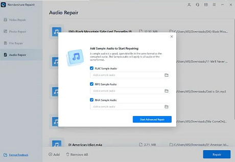 After adding the files, click “Repair” to initiate the process. A small new window appears that requires you to add a reference file for repairing. Add audio as a reference of the same file format as your original audio and click on “Start Advanced Repair.”
