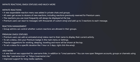 The newest version of the Telegram Desktop app has thousands of custom emojis for Premium users. For regular users, Telegram gives access to dozens of new relations, some of which were previously reserved for Premium users. It also comes with a reaction management feature, allowing group admins to control whether custom reactions are allowed in their groups.