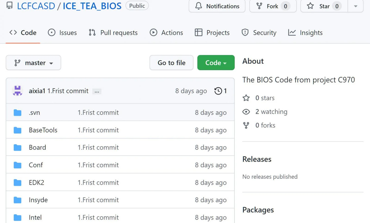 The link led to a GitHub repository named 'ICE_TEA_BIOS' that was uploaded by a user named 'LCFCASD.' This repository contained what was described as the 'BIOS Code from project C970.'