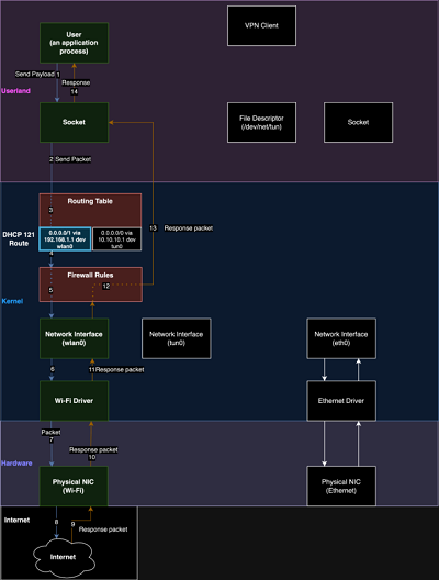 Our technique is to run a DHCP server on the same network as a targeted VPN user and to also set our DHCP configuration to use itself as a gateway. When the traffic hits our gateway, we use traffic forwarding rules on the DHCP server to pass traffic through to a legitimate gateway while we snoop on it. We use DHCP option 121 to set a route on the VPN user’s routing table. The route we set is arbitrary and we can also set multiple routes if needed. By pushing routes that are more specific than a /0 CIDR range that most VPNs use, we can make routing rules that have a higher priority than the routes for the virtual interface the VPN creates. We can set multiple /1 routes to recreate the 0.0.0.0/0 all traffic rule set by most VPNs. Pushing a route also means that the network traffic will be sent over the same interface as the DHCP server instead of the virtual network interface. This is intended functionality that isn’t clearly stated in the RFC. Therefore, for the routes we push, it is never encrypted by the VPN’s virtual interface but instead transmitted by the network interface that is talking to the DHCP server. As an attacker, we can select which IP addresses go over the tunnel and which addresses go over the network interface talking to our DHCP server.A malicious DHCP option 121 route that causes traffic to never be encrypted by the VPN process. We now have traffic being transmitted outside the VPN’s encrypted tunnel. This technique can also be used against an already established VPN connection once the VPN user’s host needs to renew a lease from our DHCP server. We can artificially create that scenario by setting a short lease time in the DHCP lease, so the user updates their routing table more frequently. In addition, the VPN control channel is still intact because it already uses the physical interface for its communication. In our testing, the VPN always continued to report as connected, and the kill switch was never engaged to drop our VPN connection. The attack can most effectively be carried out by a person who has administrative control over the network the target is connecting to. In that scenario, the attacker configures the DHCP server to use option 121. It’s also possible for people who can connect to the network as an unprivileged user to perform the attack by setting up their own rogue DHCP server.