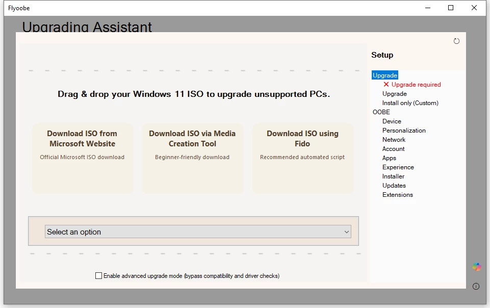 • New "OOBE" windows for custom Windows 11 installs and repairs. Currently rolled out in Preview with support for MCT and Rufus (limited CLI, no stable automation yet). Still considering whether to add a native solution, similar to the very first Flyby11 builds, holding off until future releases. Flyoobe now already covers the full spectrum: upgrades, clean installs, and the complete out-of-box experience