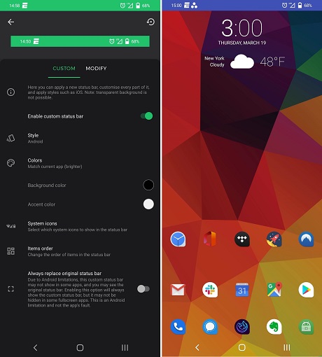 Finally, you can force the custom status bar always to appear, as Android will revert to the original status in some instances. This will result in some apps losing full-screen mode.