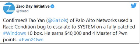 The first to demo a successful Windows 10 exploit on Wednesday and earn $40,000 was Palo Alto Networks' Tao Yan who used a Race Condition bug to escalate to SYSTEM privileges from a normal user on a fully patched Windows 10 machine.