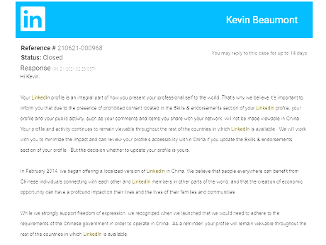 Your Linkedin profile is an integral part of how you present your professional self to the world. That’s why we believe it’s important to inform you that due to the presence of prohibited content located in the Skills & endorsements section of your Linkedin profile, your profile, and your public activity. such as your comments and items you share with your network, will not be made viewable in China. Your profile and activity continue to remain viewable throughout the rest of the countries in which Linkedin is available. We will work with you to minimize the impact and can review your profile’s accessibility within China if you update the Skills & endorsements section of your profile. But the decision of whether to update your profile is yours.