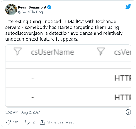 Kevin Beaumont tweeted that a threat actor was probing his Microsoft Exchange honeypot against the server's