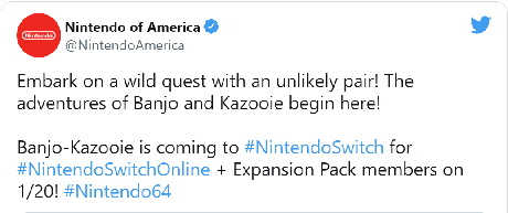 Nintendo of America has announced that Rare’s Nintendo 64 classic Banjo-Kazooie will be added to the Nintendo Switch Online + Expansion Pack tomorrow, the 20th of January.