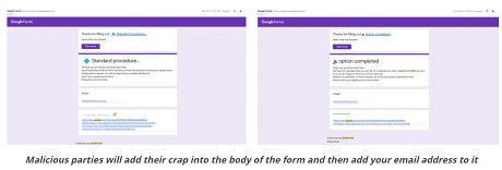 Here’s where it gets hairy. That email address looks official because, well, it is. So what’s the harm? A spammer sent you a form using Google’s automation process, so what? Well,