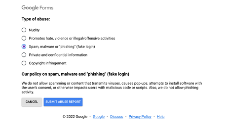 Report Abuse in Google FormsJust select the “Spam, malware or “phishing” (fake login) option as shown above and click the blue “SUBMIT ABUSE REPORT” button. Delete the email or mark it as spam and then carry on with your day. Whether or not you encounter this often, you should remain on high alert and only click things you truly trust. Where it gets difficult is when you see emails sent from official sources that contain unofficial content like this. Stay safe out there, friends!