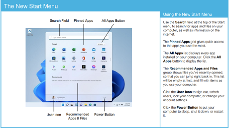 Microsoft®. Windows 11: What's New. Quick Reference Guide. The New Start Menu. Using the New Start Menu. Use the Search field at the top of the Start.