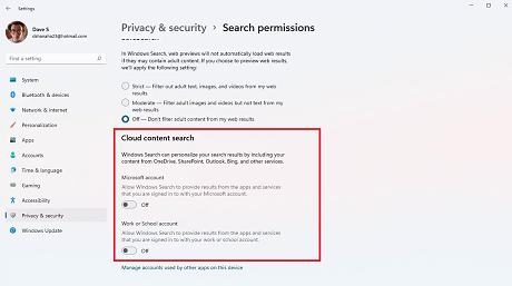 Disable Bing Search on Windows 11Unfortunately, Microsoft doesn't provide an option in Settings to turn off Bing Search. You can turn off both options in Cloud content search in Windows Settings.