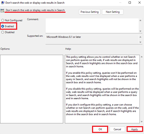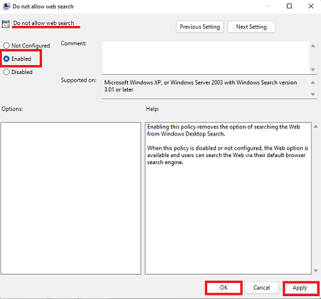3b. Double-click the policy named "Don't search the web or display web results in Search." Set the policy to Enabled and click Apply and then click OK.