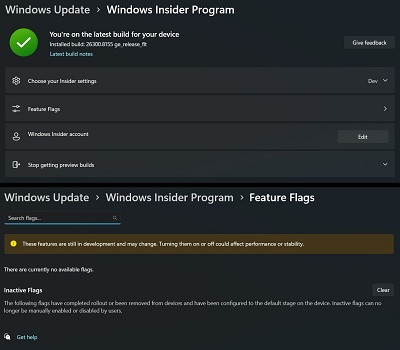 Popular Windows watcher phantomofearth spotted a new Feature Flags option in the Windows Insider Program page just below “Choose your Insider settings”