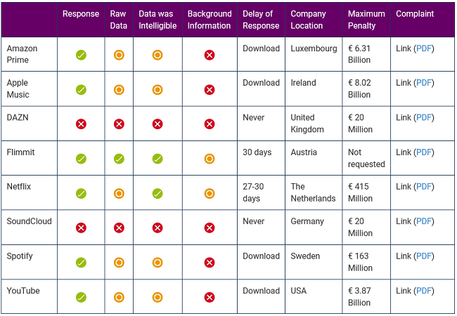 According to Max Schrems, noyb's Director, all those companies (i.e., Amazon, Apple, DAZN, Spotify, SoundCloud, YouTube, Flimmit, Netflix) have been tested to check their compliance of the General Data Protection Regulation (GDPR) "right to access" provision described in the EU regulation's Article 15.
