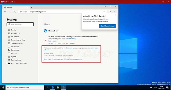 deskmodder.de, there are reports that some Windows Insiders are being added to a test that installs Microsoft Edge Insider version 75.0.111.0 in the Windows Sandbox as shown below. As you can see from the image, this browser is the Chromium-based insider build.