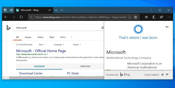 The original Edge or classic Edge comes with Cortana integration that allows users to submit search queries, ask questions and more without having to leave the browser. Cortana is located on the sidebar within the browser itself and it can render web results or definitions from Bing.