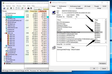 How do we verify that it is running with restrictions? The developer recommends using Process Explorer for this. You can do that with other process manager applications too. Just view the properties tab, and look for the flags as shown in the screenshot BUILTIN\Administrators, Mandatory Label and Local account and member of the Administrators group.