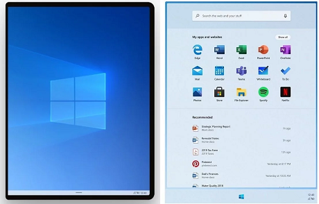 Microsoft is redesigning the Start menu experience on Windows 10X with a focus on productivity. It features a system-wide search bar along the top that can also search the web and a grid of installed apps below that in place of live tiles. It also has a "recommended" area that dynamically updates with things the user might want to jump straight into, such as recent Office documents and visited websites.