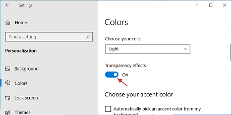 Colors and toggle the Transparency effects setting from On to Off and then back to On again for the Registry change to go into effect.