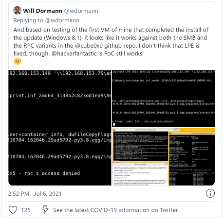 Today, as more researchers began modifying their exploits and testing the patch, it was determined that exploits could bypass the entire patch entirely to achieve both local privilege escalation (LPE) and remote code execution (RCE).