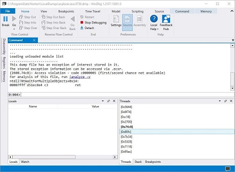 For the purposes of this story, I picked a dump file from File Explorer out of simple curiosity. I chose the file named explorer.exe.9736.dmp with a complete path specification of "C:\ProgramData\Norton\LocalDumps\explorer.exe.9736.dmp" (the quotes are automatically included when you make the context menu selection Copy as the path).