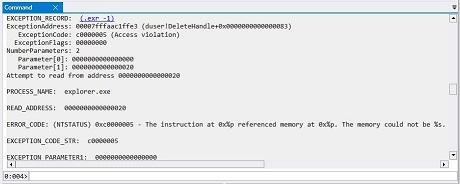 I will now reproduce a key section from that center pane to illustrate what WinDbg Preview found. It occurs in the EXCEPTION RECORD info for the explorer.exe process.