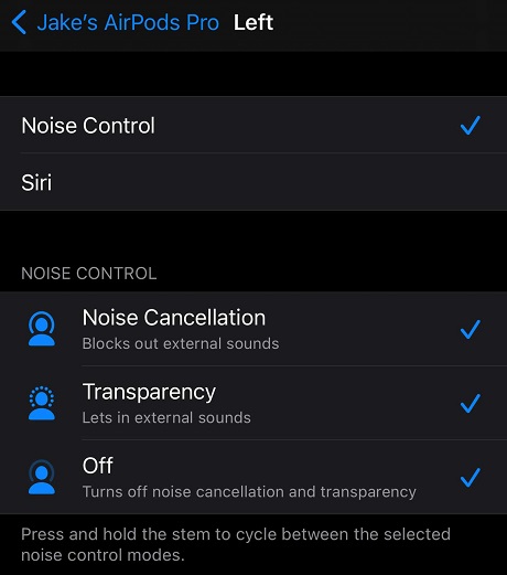 At the top, you’ll find the option to have a stem press activate Noise Control or Siri. If you choose Noise Control, you can opt into any and all of the three options listed. This is a great opportunity to add “