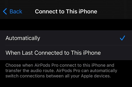 Connect to This Mac. Now, choose “When Last Connected to This iPhone” or “When Last Connected to This Mac” and your AirPods Pro won’t automatically switch to that iPhone.