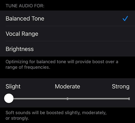 Headphone Audio. Here, you can tune your audio for Balanced Tone, Vocal Range, or Brightness, and have soft sounds boosted slightly, moderately, or strongly. Apple lets you change these settings around and tap “Play Sample” to hear the differences.