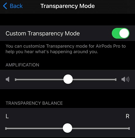 If you go through the Custom Audio Setup in the step above, you might already have discovered this feature, but you can tweak Transparency Mode yourself without going through any other settings. Just head to the bottom of the Headphone Audio page, tap “