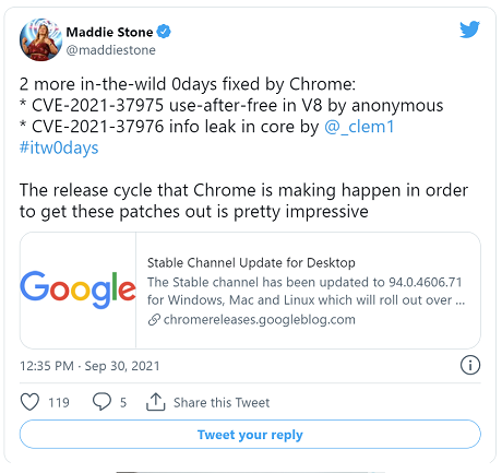 Google has released Chrome 94.0.4606.71 for Windows, Mac, and Linux, to fix two zero-day vulnerabilities that have been exploited by attackers.