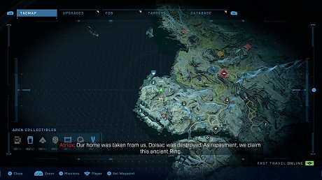 Once you set down on the Ring, you’re presented with a large map filled with enemy-controlled FOBs (Forward Operating Bases). Eradicating the resident Banished places them under UNSC control, and allows the various scattered marines you find to hold them, providing fast travel points and highlighting areas of interest in the immediate area.