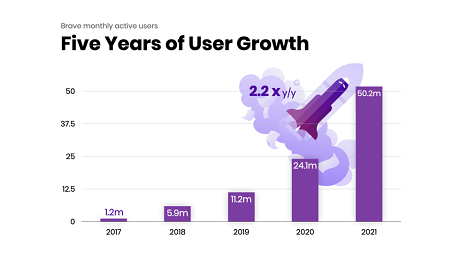Brave's growthBrave has seen huge growth on a year-by-year basis and the company said they doubled the number of monthly active users for the fifth year in a row.