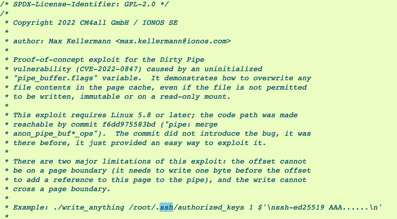 Enlarge / Comments included with Kellermann's PoC.Other researchers quickly showed that the unauthorized creation of an SSH key was only one of many malicious actions an attacker can take when exploiting the vulnerability. This program, for instance, hijacks a SUID binary to create a root shell, while this one allows untrusted users to overwrite data in read-only files: